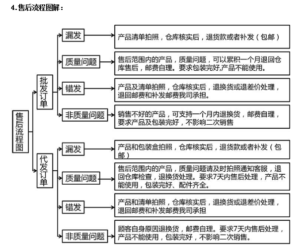 9.3 批发的订单售后要求:一个月内及时通知客服登记,质量问题产品可退回仓库售后处理,邮费自理,